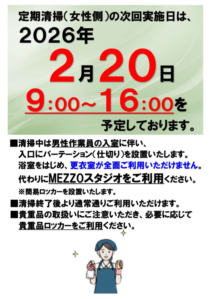 【女性浴室・更衣室】清掃メンテナンスのお知らせ