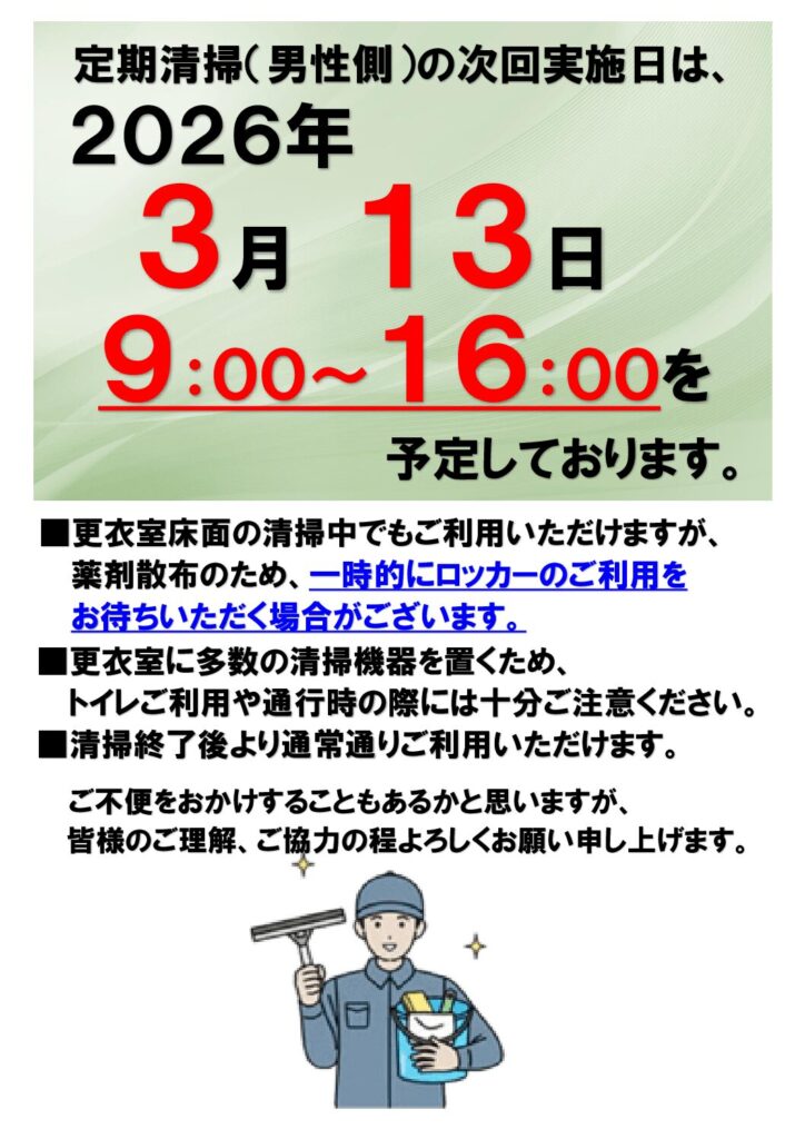 清掃メンテナンス(または定期清掃)につきまして、男性浴室・更衣室の実施日について以下の通り、お知らせいたします。
