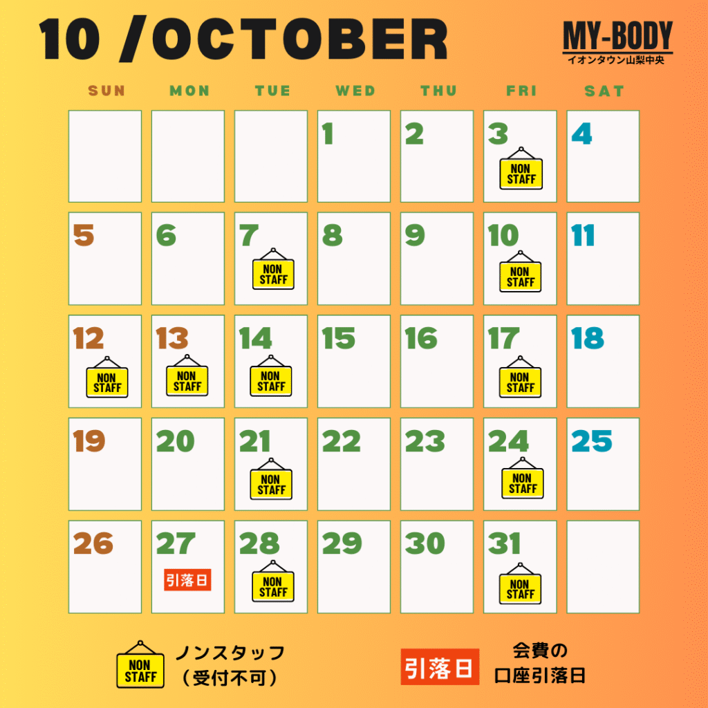 2025.09.29 イオンタウン山梨中央店 10月受付カレンダー 10月の受付可能日です。 変則的にスタッフが不在となる日がございますので、ご注意ください。 ご不便をおかけしますが、よろしくお願いいたします。 カテゴリ 南アルプス 塩山 清水 韮崎 富士宮 前橋店 富士川店 潮見 全店舗 西八王子店 南橋本店 イオンタウン山梨中央店 フォレストモール甲斐竜王店 牧之原店 佐久インターウェーブ店