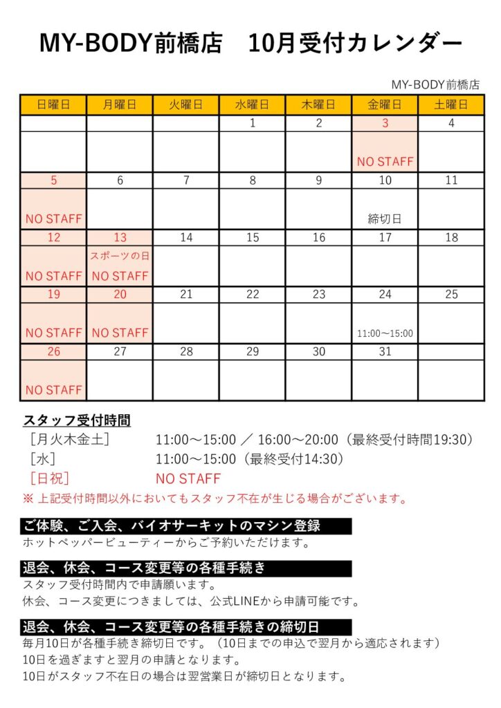2025.10.02 前橋店 10月受付カレンダー カテゴリ 全店舗 潮見 南橋本店 イオンタウン山梨中央店 フォレストモール甲斐竜王店 富士川店 韮崎 塩山 南アルプス 石和 牧之原店 富士宮 清水 佐久インターウェーブ店 前橋店