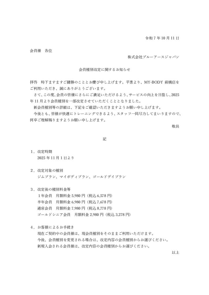 この度、MY-BODY前橋店は、会員の皆様にさらにご満足いただけるよう、サービスの向上を目指し、2025年11月より会員種別を一部改定させていただくこととなりました。