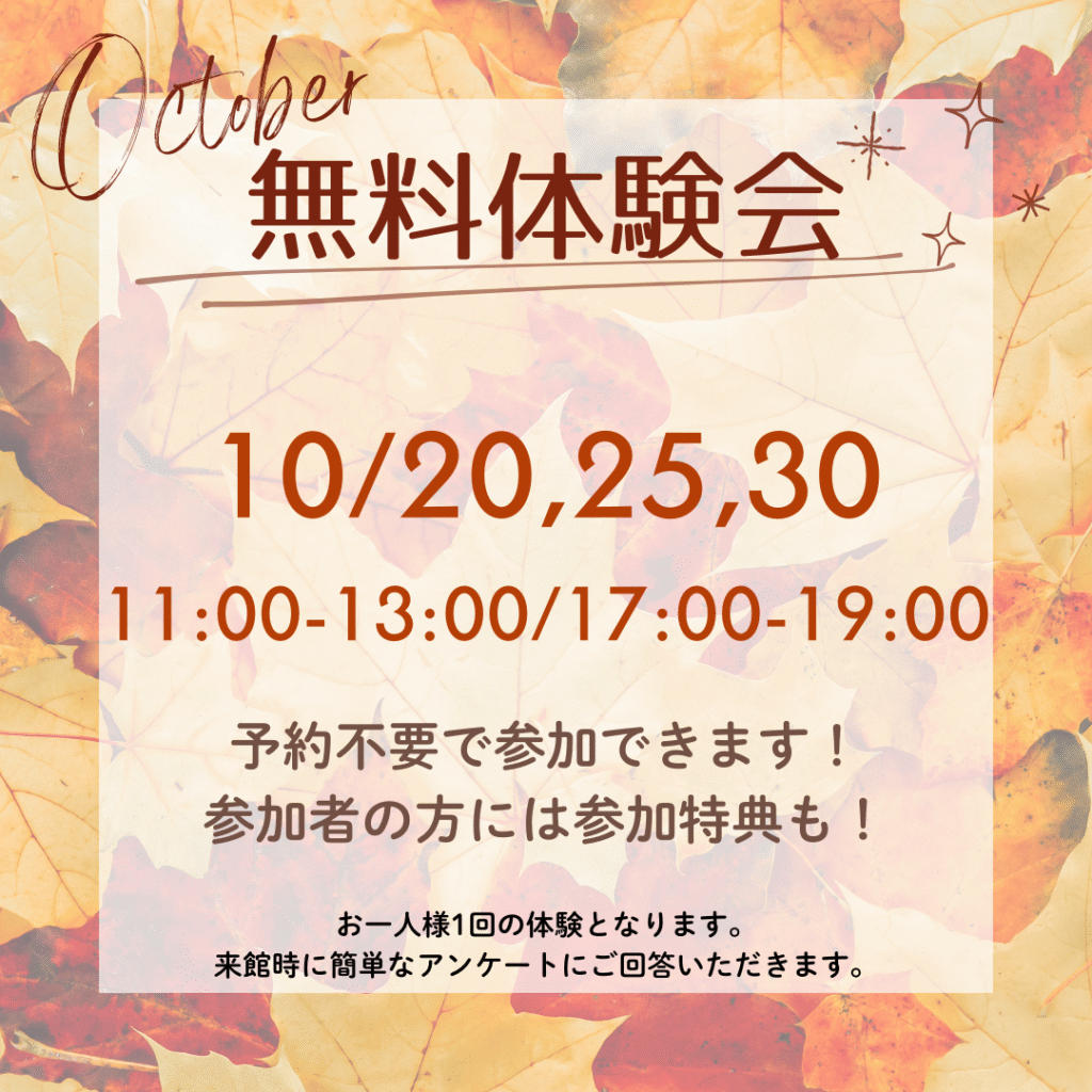 2025.10.15 全店舗 10月【無料体験会】開催決定! 10月も開催します!無料体験会! 今回は10月20日/25日/30日の3日間! 最新ジムを無料で体験できるチャンス! 皆様のご参加お待ちしております! カテゴリ 全店舗 潮見 南橋本店 イオンタウン山梨中央店 フォレストモール甲斐竜王店 富士川店 韮崎 塩山 南アルプス 石和 牧之原店 富士宮 清水 佐久インターウェーブ店 前橋店