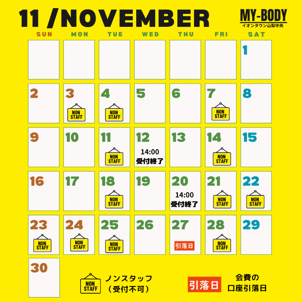 2025.10.29 イオンタウン山梨中央店 11月受付カレンダー 11月の受付可能日です。 変則的にスタッフが不在となる日がございますので、ご注意ください。 ご不便をおかけしますが、よろしくお願いいたします。 カテゴリ 全店舗 潮見 南橋本店 イオンタウン山梨中央店 フォレストモール甲斐竜王店 富士川店 韮崎 塩山 南アルプス 石和 牧之原店 富士宮 清水 佐久インターウェーブ店 前橋店