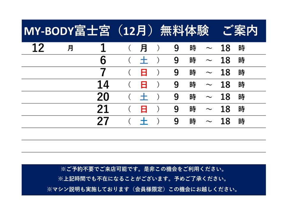 2025.11.18 富士宮 12月施設見学&無料体験会のお知らせ 無料体験を行う際は、室内シューズご持参の程よろしくお願いいたします。 カテゴリ 全店舗 潮見 南橋本店 イオンタウン山梨中央店 フォレストモール甲斐竜王店 富士川店 韮崎 塩山 南アルプス 石和 牧之原店 富士宮 清水 佐久インターウェーブ店 前橋店
