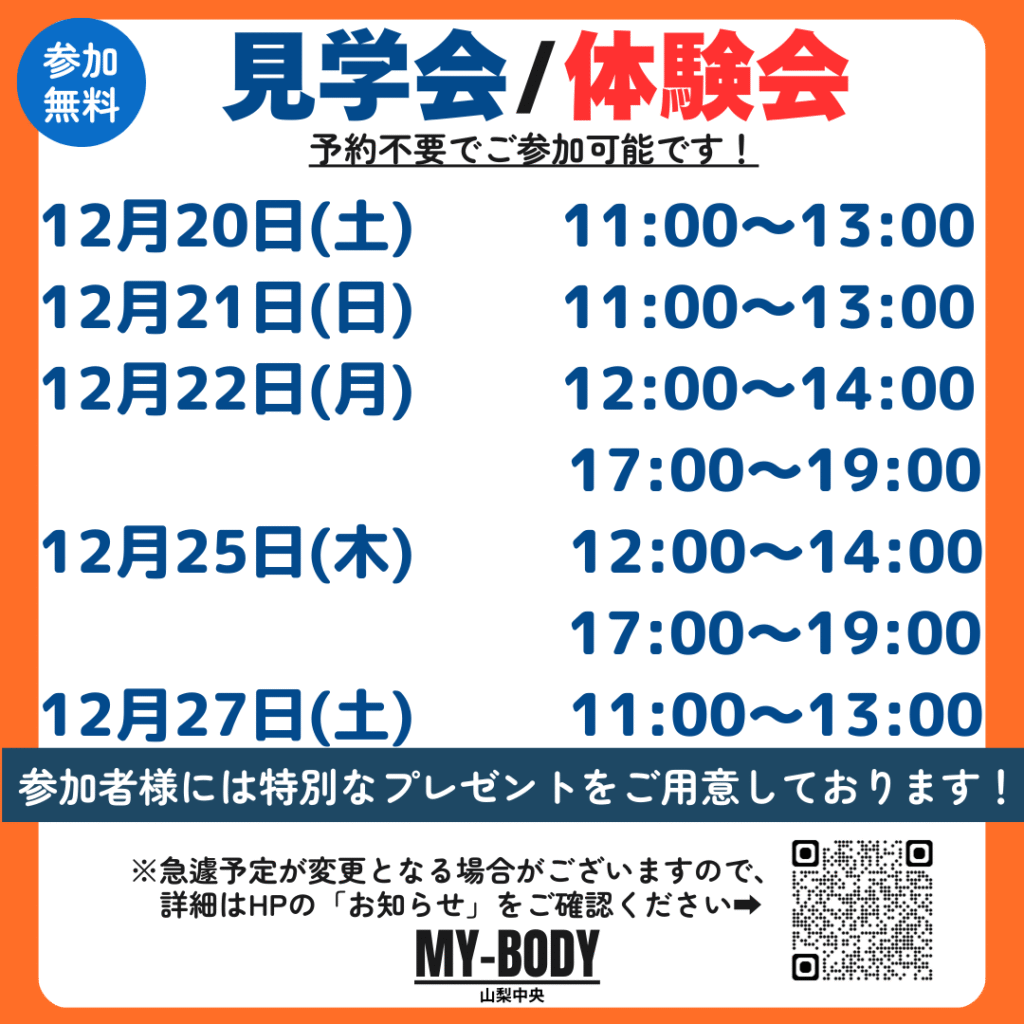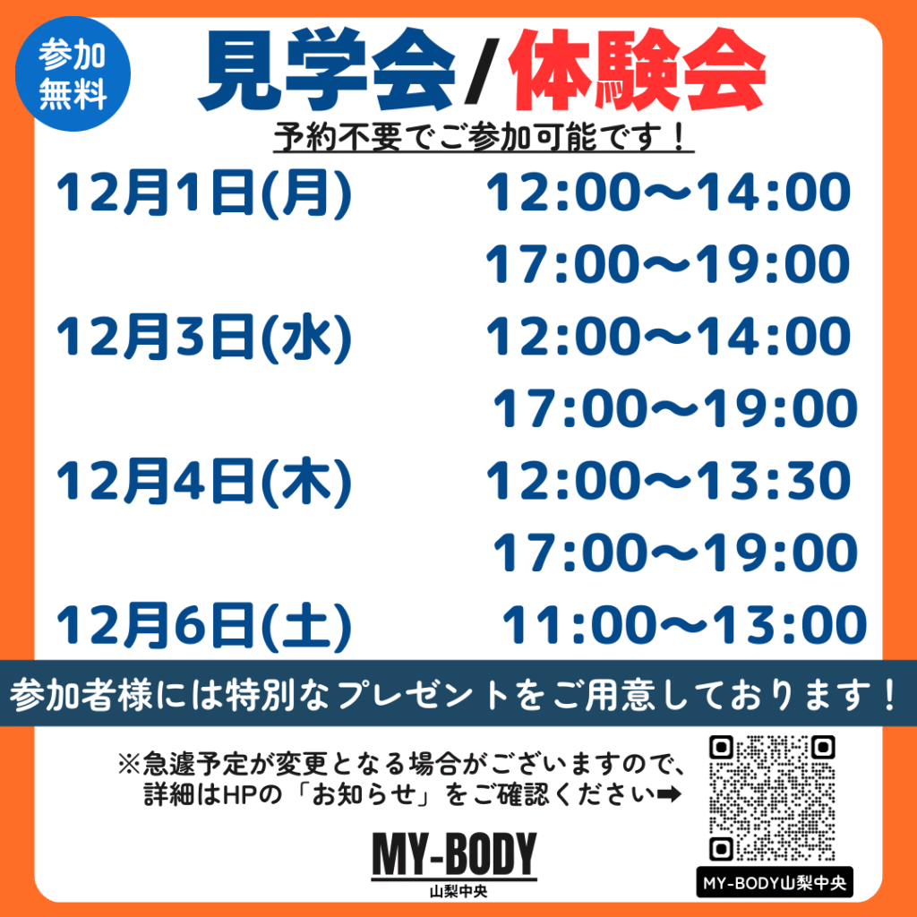 2025.11.27 イオンタウン山梨中央店 【参加無料】見学会/体験会のご案内 12月の見学会・体験会のスケジュールです!! 予約不要!参加無料です! カテゴリ 全店舗 潮見 南橋本店 イオンタウン山梨中央店 フォレストモール甲斐竜王店 富士川店 韮崎 塩山 南アルプス 石和 牧之原店 富士宮 清水 佐久インターウェーブ店 前橋店