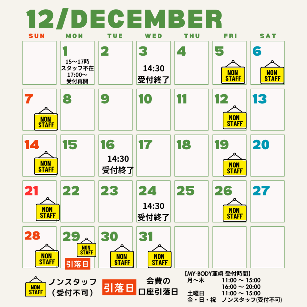 2025.11.27 韮崎 12月受付カレンダー カテゴリ 全店舗 潮見 南橋本店 イオンタウン山梨中央店 フォレストモール甲斐竜王店 富士川店 韮崎 塩山 南アルプス 石和 牧之原店 富士宮 清水 佐久インターウェーブ店 前橋店