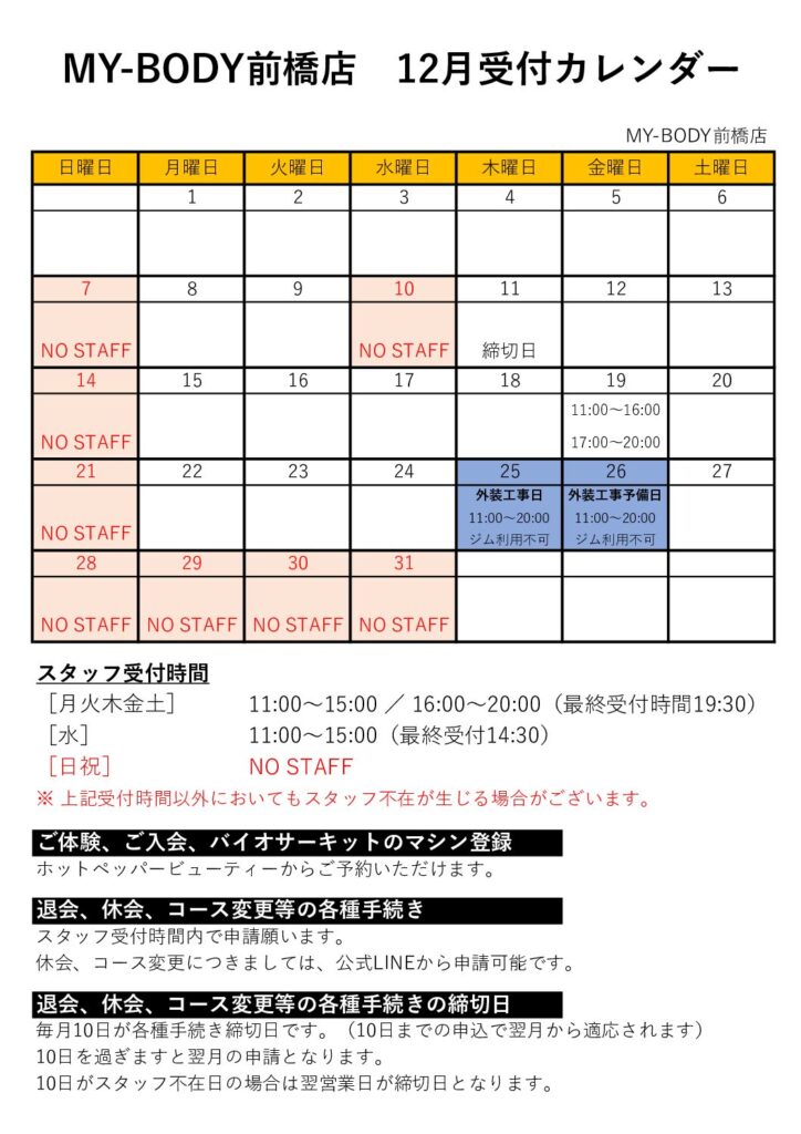 2025.12.01 前橋店 12月受付カレンダー カテゴリ 全店舗 潮見 南橋本店 イオンタウン山梨中央店 フォレストモール甲斐竜王店 富士川店 韮崎 塩山 南アルプス 石和 牧之原店 富士宮 清水 佐久インターウェーブ店 前橋店