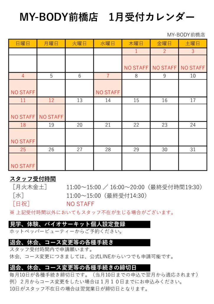 2026.01.07 前橋店 1月受付カレンダー カテゴリ 全店舗 潮見 南橋本店 イオンタウン山梨中央店 フォレストモール甲斐竜王店 富士川店 韮崎 塩山 南アルプス 石和 牧之原店 富士宮 清水 佐久インターウェーブ店 前橋店