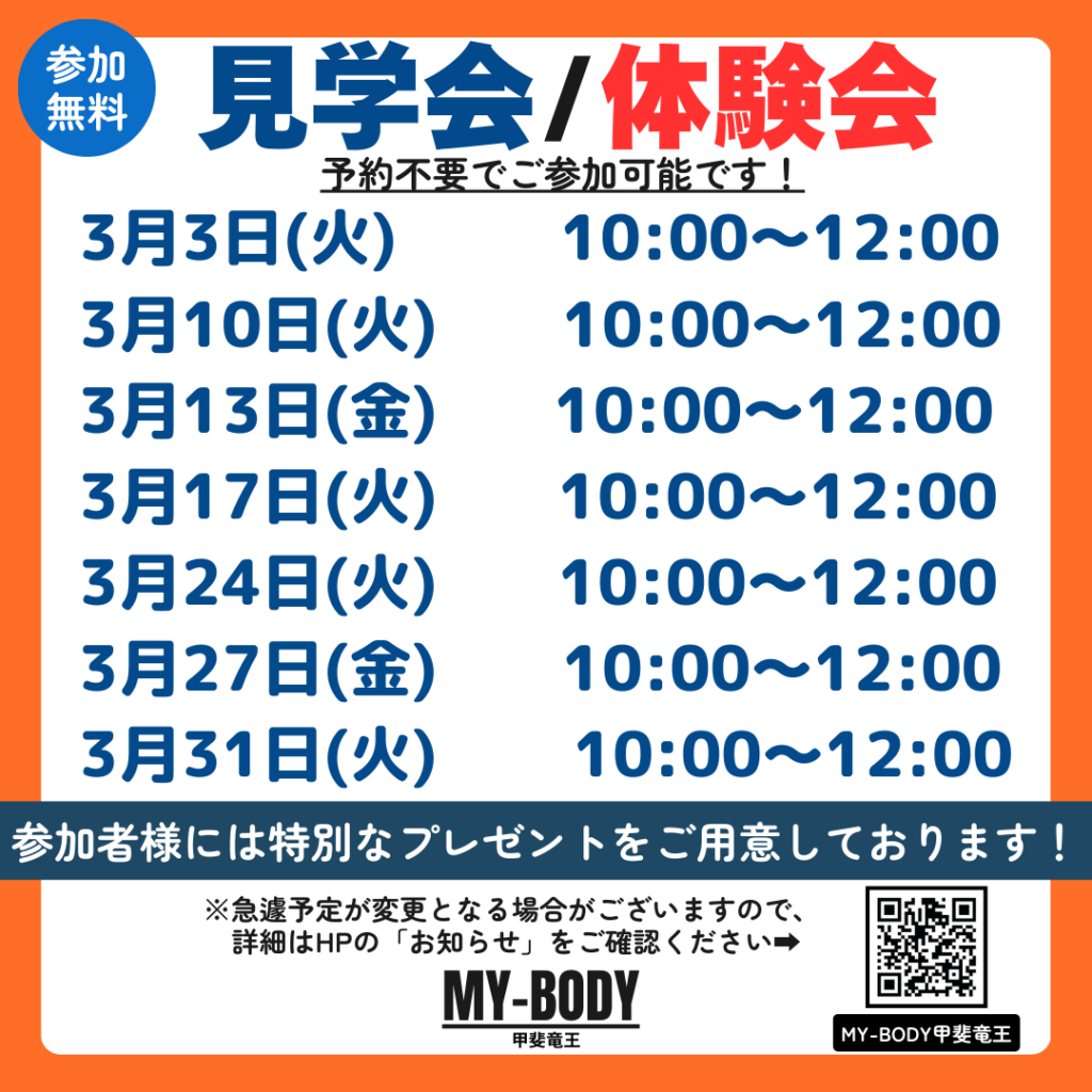 2026.02.26 フォレストモール甲斐竜王店 【参加無料】3月の見学会/体験会のご案内 3月の見学会・体験会のスケジュールです!! 予約不要!参加無料です! カテゴリ 全店舗 潮見 南橋本店 イオンタウン山梨中央店 フォレストモール甲斐竜王店 富士川店 韮崎 塩山 南アルプス 石和 牧之原店 富士宮 清水 佐久インターウェーブ店 前橋店