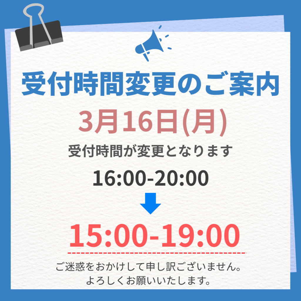 2026.03.16 南アルプス 【南アルプス店】受付時間変更のお知らせ カテゴリ 全店舗 潮見 南橋本店 イオンタウン山梨中央店 フォレストモール甲斐竜王店 富士川店 韮崎 塩山 南アルプス 石和 牧之原店 富士宮 清水 佐久インターウェーブ店 前橋店