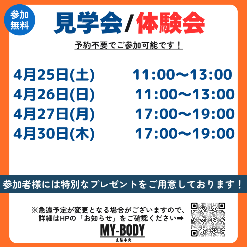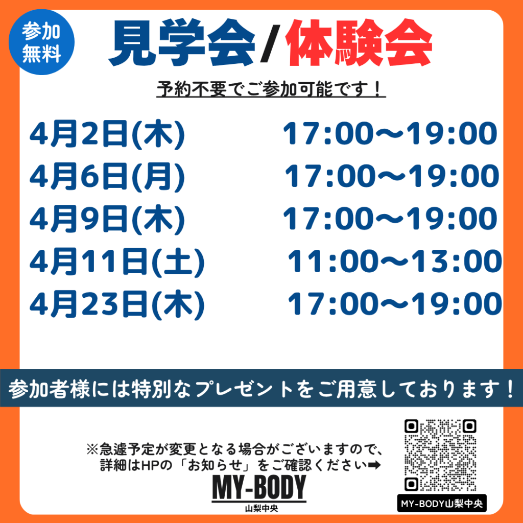 2026.03.25 イオンタウン山梨中央店 【参加無料】4月の見学会/体験会のご案内 4月の見学会・体験会のスケジュールです!! 予約不要!参加無料です! カテゴリ 全店舗 潮見 南橋本店 イオンタウン山梨中央店 フォレストモール甲斐竜王店 富士川店 韮崎 塩山 南アルプス 石和 牧之原店 富士宮 清水 佐久インターウェーブ店 前橋店