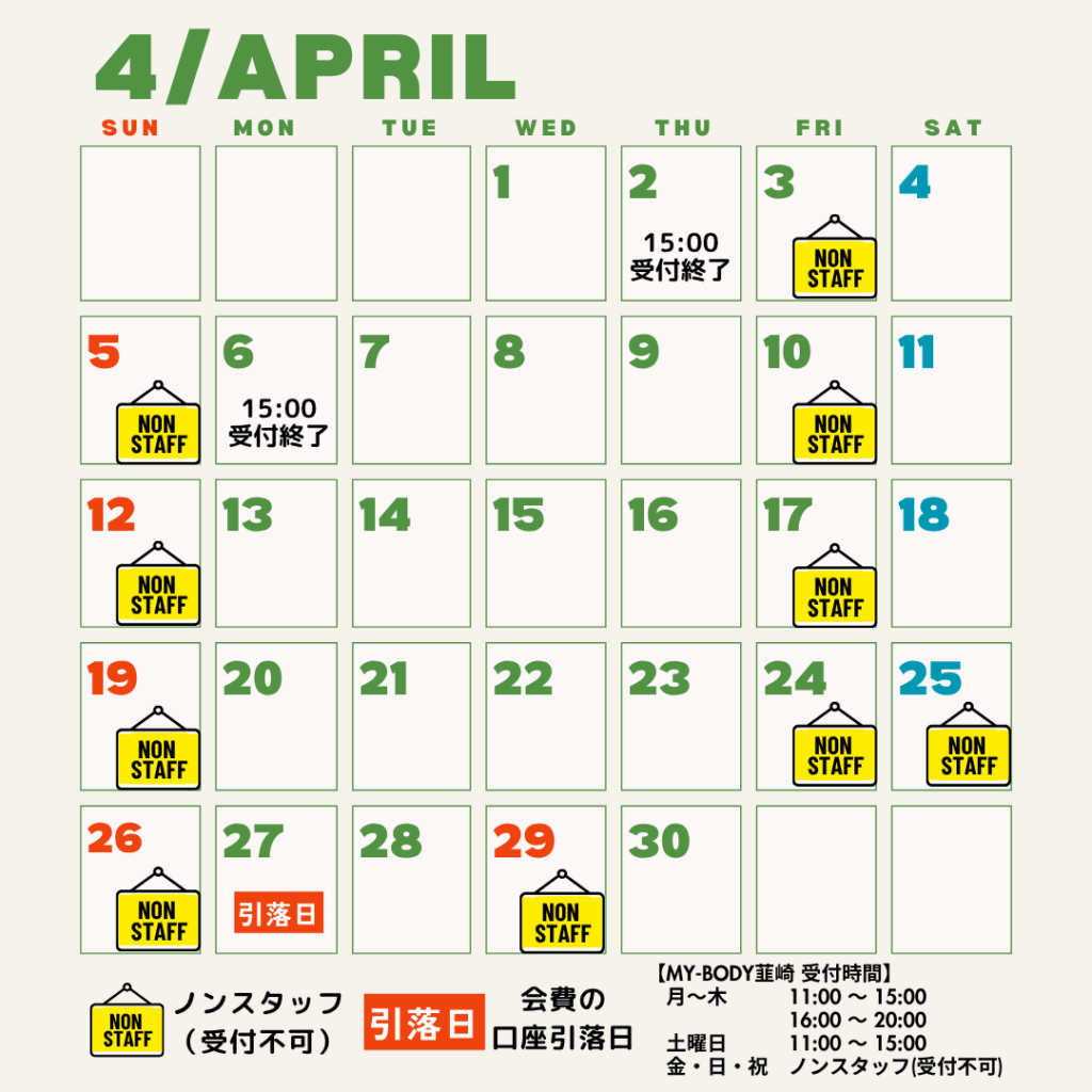 2026.03.26 韮崎 4月受付カレンダー カテゴリ 全店舗 潮見 南橋本店 イオンタウン山梨中央店 フォレストモール甲斐竜王店 富士川店 韮崎 塩山 南アルプス 石和 牧之原店 富士宮 清水 佐久インターウェーブ店 前橋店