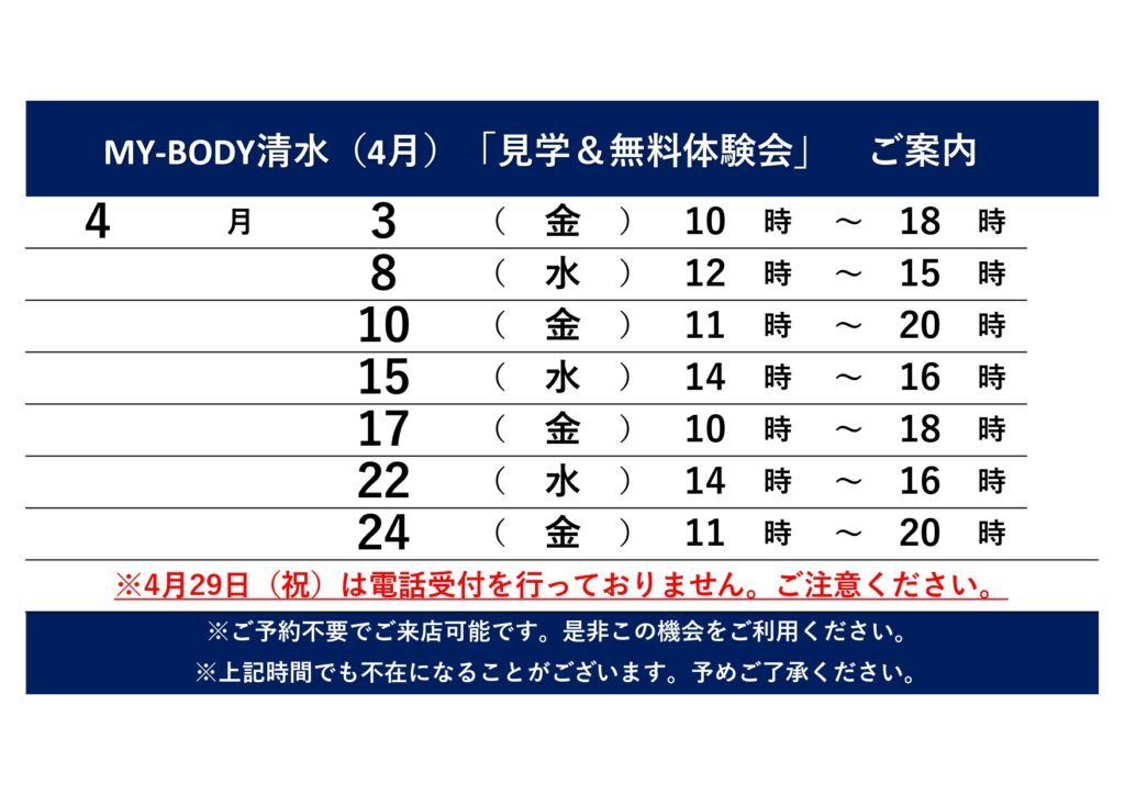 2026.04.07 清水 4月施設見学&体験会のお知らせ(修正) 先月公開しておりました「4月」の施設見学&見学会に日程の誤りがございました。お詫びして訂正いたします。 カテゴリ 全店舗 潮見 南橋本店 イオンタウン山梨中央店 フォレストモール甲斐竜王店 富士川店 韮崎 塩山 南アルプス 石和 牧之原店 富士宮 清水 佐久インターウェーブ店 前橋店
