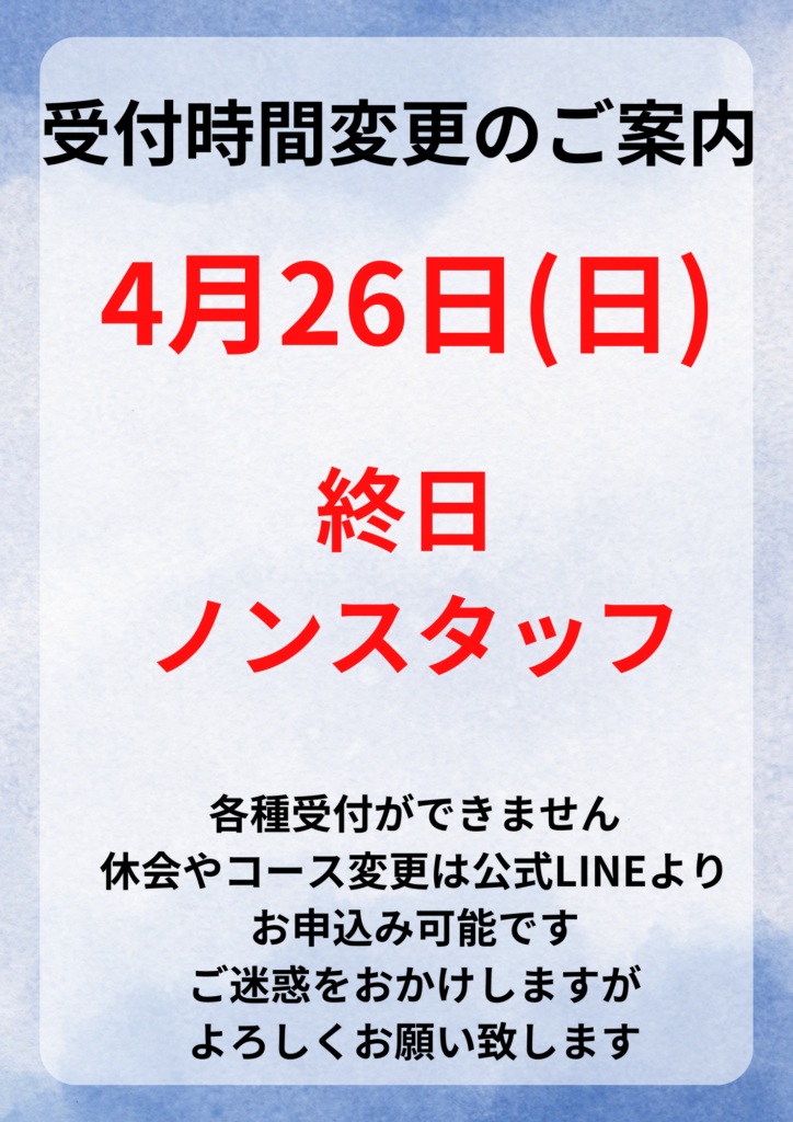 2026.04.24 富士川店 4/26(日)ノンスタッフのお知らせ カテゴリ 全店舗 潮見 南橋本店 イオンタウン山梨中央店 フォレストモール甲斐竜王店 富士川店 韮崎 塩山 南アルプス 石和 牧之原店 富士宮 清水 佐久インターウェーブ店 前橋店