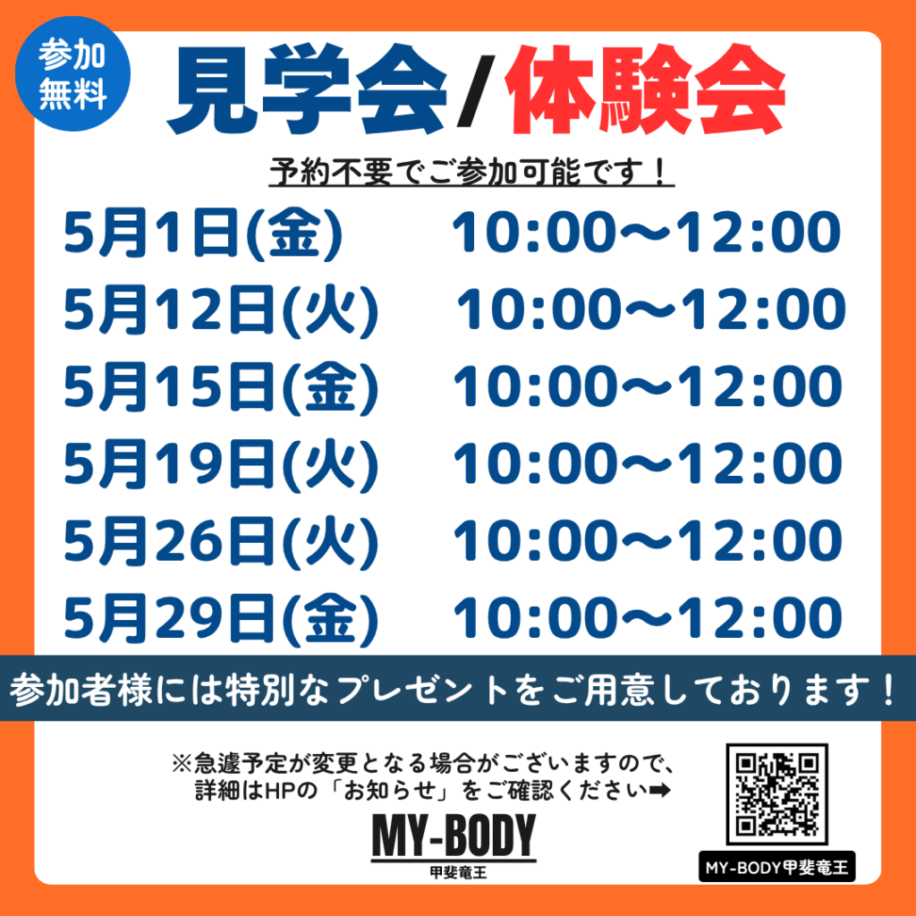 2026.04.27 フォレストモール甲斐竜王店 【参加無料】5月の見学会/体験会のご案内 5月の見学会・体験会のスケジュールです!! 予約不要!参加無料です! カテゴリ 全店舗 潮見 南橋本店 イオンタウン山梨中央店 フォレストモール甲斐竜王店 富士川店 韮崎 塩山 南アルプス 石和 牧之原店 富士宮 清水 佐久インターウェーブ店 前橋店