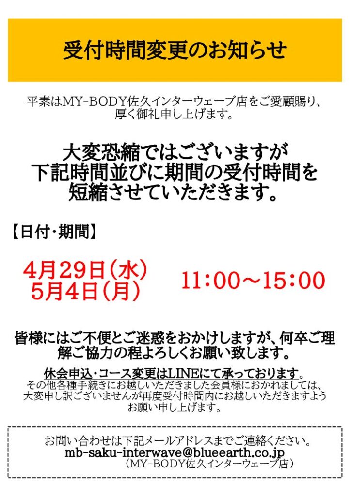 2026.04.28 佐久インターウェーブ店 【4/29(水)並びに5/4(月)時間短縮のお知らせ】 カテゴリ 全店舗 潮見 南橋本店 イオンタウン山梨中央店 フォレストモール甲斐竜王店 富士川店 韮崎 塩山 南アルプス 石和 牧之原店 富士宮 清水 佐久インターウェーブ店 前橋店